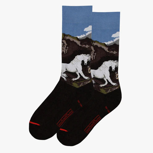 Timeless sock design featuring the artwork "A Horse Frightened by a Lion" by George Stubbs.